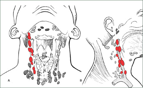 Cancer of the hypopharynx has a high propensity for lymphatic invasion, with most patients having cervical lymph node metastases at the time of initial presentation. The hypopharynx-especially the piri-orm sinus-must always be examined in an adult with cervical lymph node metastases and no obvious primary cancer site. Occult cervical lymph node metastases (ie, clinically negative but histologically positive) are also common, causing the overall incidence of cervical lymph node metastases at presentation to be approximately 75%. The principal cervical lymph node groups involved are the upper, mid, and lower jugular nodes (levels II, III, and IV); the retropharyngeal nodes of Ranvier; and, less frequently, the cervical lymph nodes along the spinal accessory nerve in the posterior triangle (level V).