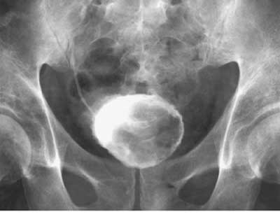 Figure 20-3. Image of the urinary bladder obtained on an intravenous urogram. The filling defect represents a papillary bladder cancer.